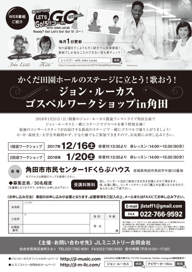 2018年1月21日(日)開催のジョン・ルーカス凱旋ワンマンライブ角田公演で、ジョン・ルーカスと一緒にステージでゴスペルを歌う特別企画!最強のコンサートスタッフがお届けする最高のステージで一緒にゴスペルで盛り上がりましょう!小・中・高校生・大学生年齢問わず、どなた様でもご参加できますので、お気軽に申込み下さい。