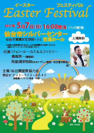 Schedule 2017.05.07【16:00開演(15:30開場)】Easter Festival 仙台市シルバーセンター Facebook twitter 仙台市青葉区花京院1-3-2 交流ホール ※会場には駐車場がありません。 公共交通機関をご利用いただくか、近隣のコインパーキングをご利用ください。 主演:ジョン・ルーカス&JLファミリー、春風笑一(腹話術)、阿部頌栄牧師(日本ナザレン教団 仙台富沢教会)他 主催:仙台圏宣教協力会 問合せ:022-373-0645(泉聖書バプテスト教会 中野) 【19:15~20:45】ゴスペル教室体験レッスン♪ in 御茶ノ水ゴスペル教室スタート!【19:15~20:45】ゴスペル教室体験レッスン♪ in 御茶ノ水ゴスペル教室スタート!Schedule